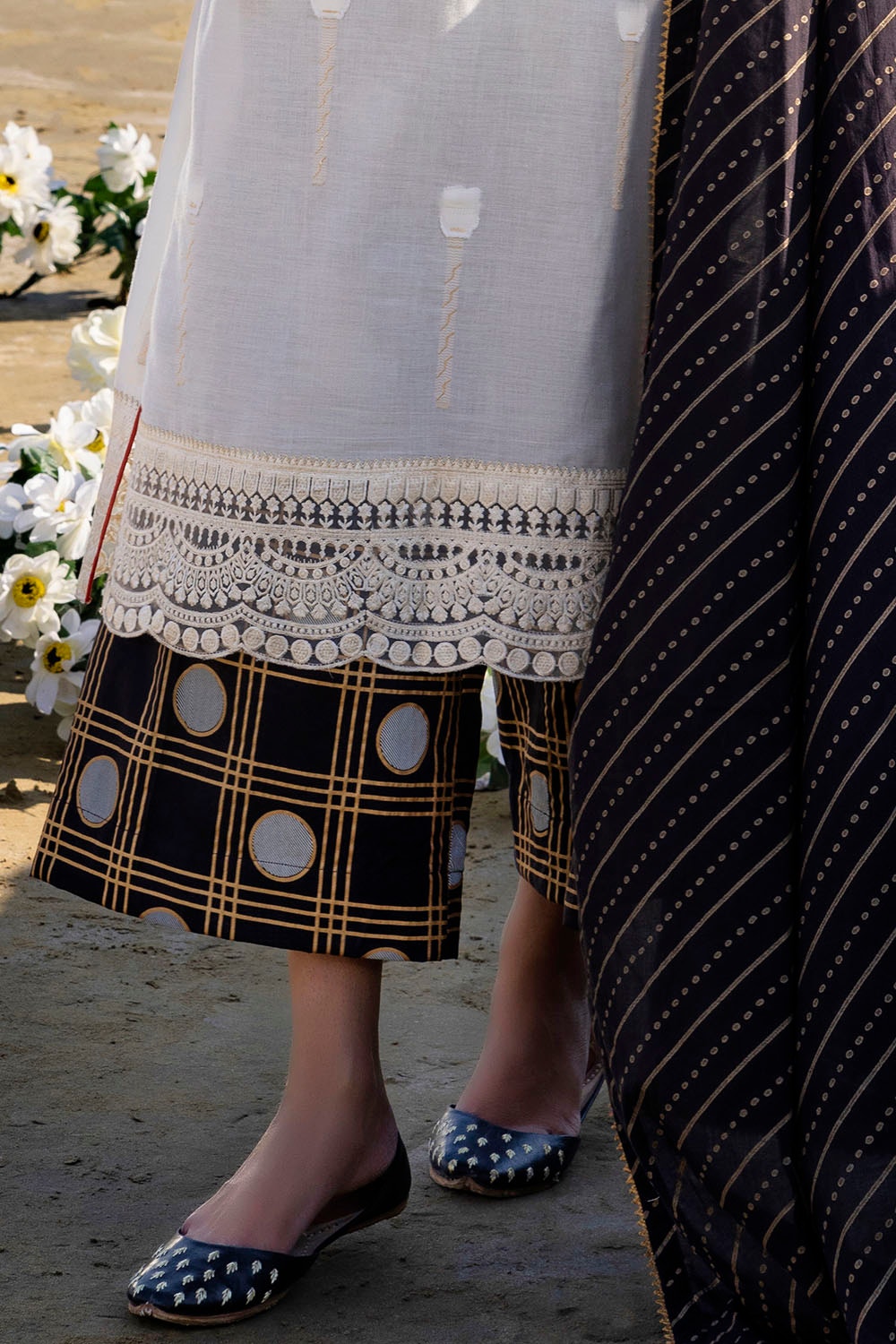 Jacquard Shirt with Embroidered Lace for Neck. Embroidered Borders for Front & Back on Organza - 2.76 Meters