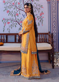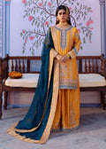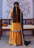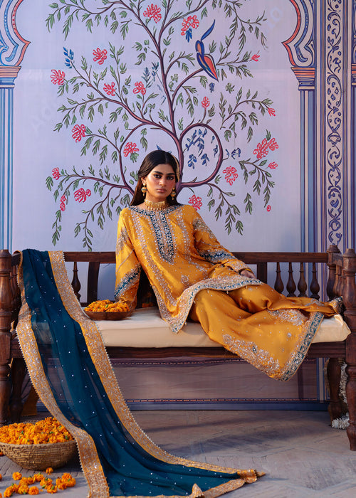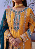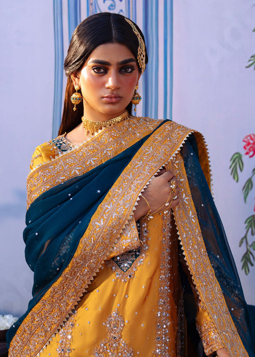 Mehrāb stands out in a vibrant marigold palette accented with deep teal embroidery inspired by traditional court murals. The heavily worked kameez is balanced with a contrasting dupatta that frames the silhouette beautifully. This design embodies festive grandeur and ceremonial splendor, ideal for statement occasions.