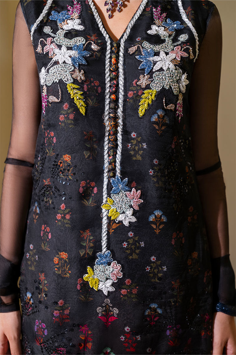 Includes: Shirt with Trousers Black Swan — timeless elegance with a bold twist. A V-neck long shirt paired with loose-fit trousers and an organza dupatta, featuring embroidered florals and exquisite hand embellishment, enhanced with vibrant kut dana and sequin motifs. Churidar sleeves with printed lining add a refined touch, while embellished trousers and a scalloped organza dupatta complete the look with effortless grace.