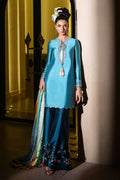 Includes: Shirt with Trousers Floral Appliqué — bold elegance in every detail. This teal mid-thigh shirt with waist-high slits is paired with a loose-fit trouser and a vibrant printed chimose silk dupatta. The shirt features an intricately embellished front and back neckline, accented with dabka, naqshi, crystals, and sequin work, finished with contrast crisscross detailing and delicate tassels for added flair. The sleeves are embroidered with a striking geometric border, while the loose-fit trouser is elevated with 3D laser-cut leather florals—bringing texture and depth to the look. A printed silk dupatta ties it all together with effortless grace.
