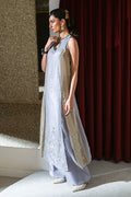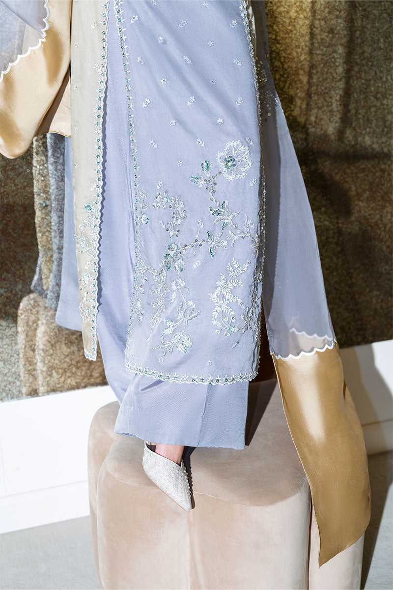 Black Swan — timeless elegance with a bold twist. A V-neck long shirt paired with loose-fit trousers and an organza dupatta, featuring embroidered florals and exquisite hand embellishment, enhanced with vibrant kut dana and sequin motifs. Churidar sleeves with printed lining add a refined touch, while embellished trousers and a scalloped organza dupatta complete the look with effortless grace.