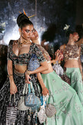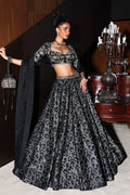 An effortlessly captivating black ensemble featuring a deep neck blouse, intricately hand-embellished with florals using naqshi, dabka, and sequin work. The sleeves are adorned with delicate floral motifs and a finely detailed border. Paired with a stunning block-printed lehnga, gathered at the waist, complete with an embellished belt and can-can for volume. A net dupatta complements the look with contrast sequin spray, floral bunches at the ends, and a black border finish, adding a touch of elegance to the entire outfit.