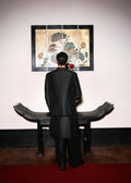 A three-piece eastern ensemble in pure black raw silk. The tailored blazer features tonal embroidery on the sleeves, finished with hand embellishments in sequins and cut daana for a subtle shimmer. Paired with a jet black raw silk kurta with a band collar and placket, and matching straight trousers — a look that balances structure with understated elegance.