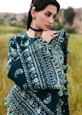 A long teal khaddar shirt featuring Kashmiri-inspired paisley embroidery on the upper body, finished with delicate embroidered borders at the slit and hem. The look is elevated with heavily embroidered traditional sleeves in monotone hues, paired with border-finished culottes and a matching wool shawl adorned with foursided embroidery, center spray, and ornate pallu corners. A perfect harmony of heritage and elegance for the winter season.
