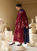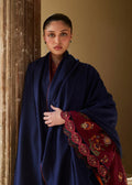 Turn up the charm in this deep maroon three-piece khaddar outfit, featuring multihued embroidery, overlapped embroidered neck and Patti on hem edges on a shirt with statement bell sleeves and embroidered Patti on sleeves. The embroidered culottes adds an elegant twist. It is paired with navy blue embroidered khaddar shawl. perfect for effortless day-to-evening style in winters.