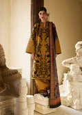 Stay warm and stylish in this three - piece mustard khaddar outfit, featuring elegant black embroidery on a shirt and sleeves, lace on V_ Neck Delicate embroidery on the back of the shirt. Its Paired with a delicately embroidered standout culottes, paired with black printed shawl, this look blends comfort with effortless charm. Perfect for elevating your everyday style in this winters.
