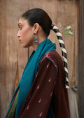 This elegant three-piece women's outfit features a chocolate brown khaddar shirt with intricate embroidery details on the front and an asymmetric neckline. The sleeves are adorned with a contrasting turquoise embroidered Patti. It comes with embroidered culottes, finished with delicate lace details, and is paired with a matching embroidered shawl in a contrasting turquoise.