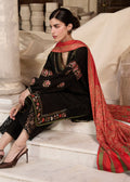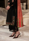 A black khaddar shirt, exquisitely embroidered with a vibrant, multi-colored pattern and delicate lace detailing. The side slits and neckline feature intricate cutwork embroidery in the base black color. It boasts elegant balloon sleeves, also adorned with embroidery. The outfit is paired with matching culottes, featuring complementary cutwork embroidery and lace details. To complete the ensemble, a contrasting printed shawl is included.