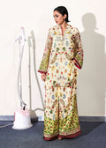 A butter yellow silk coord set featuring a delicate floral print — spaced out across the front and more densely placed along the sleeves for visual contrast. The shirt is detailed with a button loop neckline and collar band, while parrot green composed borders line the sleeve hems with subtle slit detailing. Paired with relaxed, straight-fit pants in a matching print, finished with a parrot green border along the hem. A soft yet striking balance of color, composition, and ease.