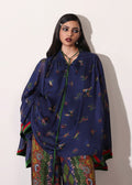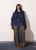 A midnight blue mid-thigh length floral printed silk shirt with red and green satin silk trims on full-circle sleeves and green satin tassel detailing on the neckline. Paired with multicolored floral printed wide-leg pants for a bold, effortless statement.