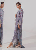 The Grey Cotton/Chiffon 3PC Embroidered Printed Suit from our Spring Collection features a printed shirt with cutwork embroidery, band collar, three quarter sleeves, paired with cutwork embroidered trouser & dupatta.