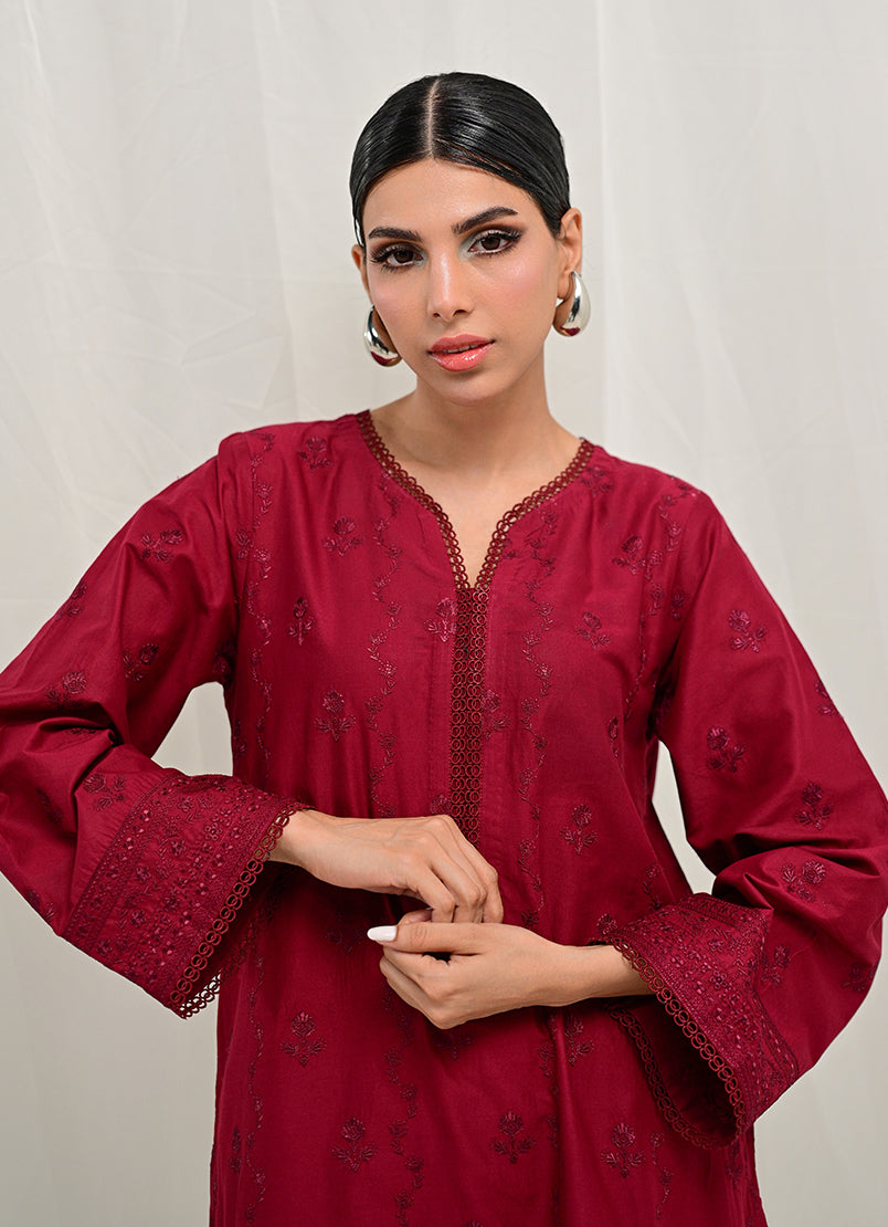 This deep maroon embroidered co-ord set from our Spring Staples '25 Collection features a straight silhouette, round neckline with a slit, full-length embroidered sleeves paired with embroidered trousers.