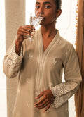 The Stone Grey Cotton Embroidered Co-ord Set from our Spring The Tea '25 Collection features a straight silhouette, V neckline, full length embroidered sleeves, paired with embroidered izaar.