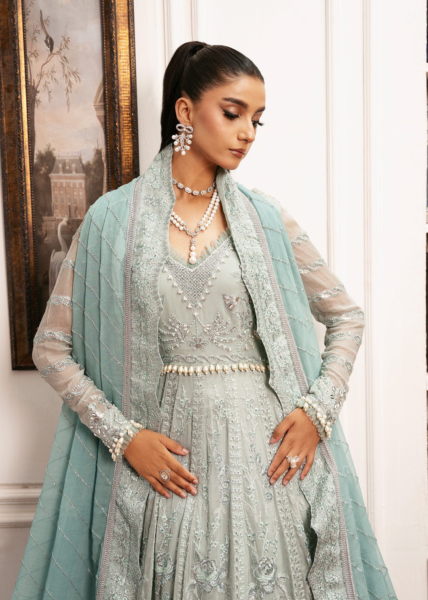 Exquisite Rose: An ethereal chiffon maxi, adorned with intricate self-tone resham thread embroidery, shimmering tilla, and sequins cascading gracefully across every panel. The ensemble is perfected with an embroidered silk border. The yoke and sleeves exude sophistication, embellished with delicate Swarovskis, cutdana, and lustrous pearls. Paired with a strikingly deeper ferozi chiffon dupatta, lavishly embroidered throughout and framed with a meticulously crafted silk border on all four sides.