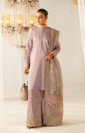 Discover the beauty of handmade details in lavender. This kurta set showcases handmade fabric buttons and embellished sleeves on a delicate lavender shirt. It’s paired with Indian zari trousers with embroidered borders, and a truly unique dupatta with sequins, multiple embroidered pallus, and a four-sided finish.