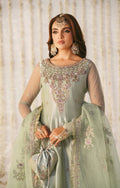 Embrace the Eid spirit in powder mint. This panelled pishwas features a hand-embellished neckline with exquisite detailing, delicate tulle sleeves with resham and sequin embroidery, and beautifully bordered hem. The organza dupatta, finished with kiran, completes this perfect Eid look.