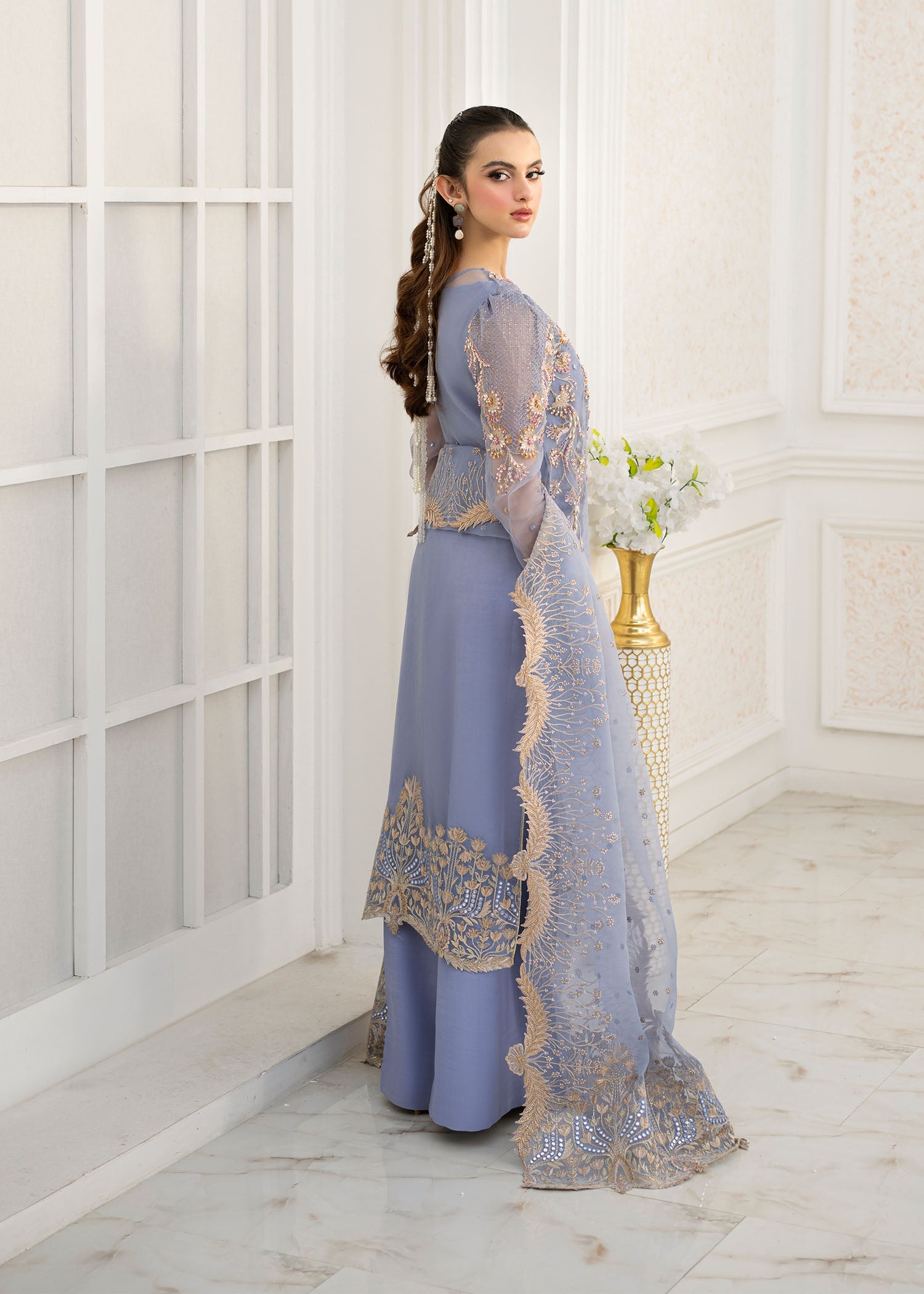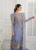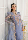 Lavender Blue embroidered organza straight shirt with hand embellishment crystals and pearls with scalloped embroidered dupatta paired with pk raw silk lose bottom pants