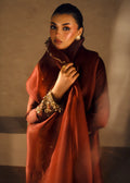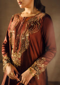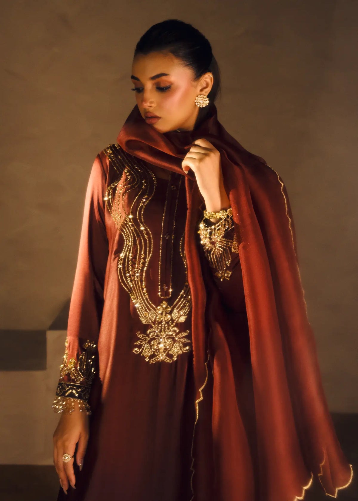 'Suffused in brown ombre, the charmeuse silk elongated a line silhouette is a study in understated opulence. Gold crystal and pipe work unfurl across the sleeves, and neckline, their intricacy elevating the ensemble . Paired with matching cigarette trousers and a pure organza scalloped dupatta - Brown Ombre channels elegance.