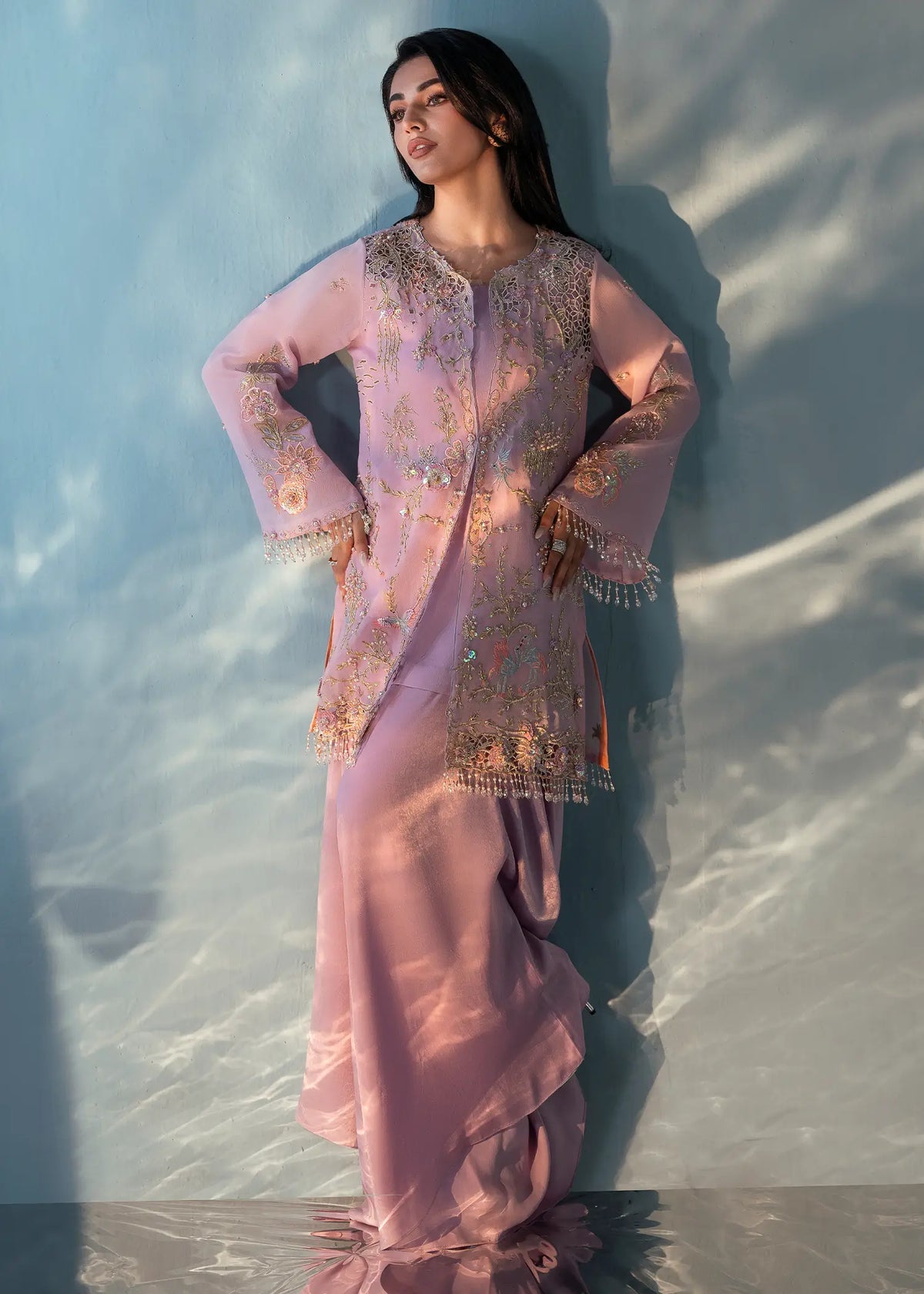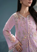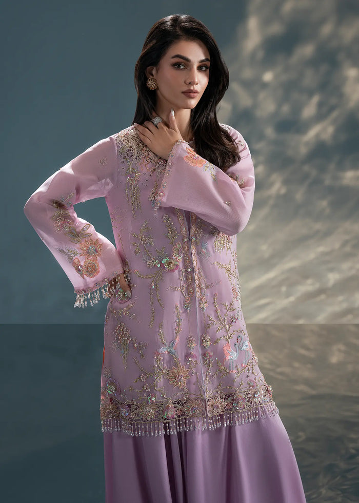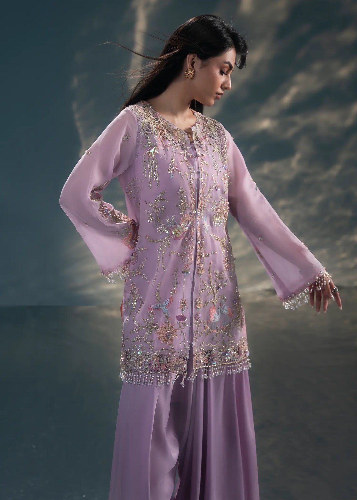 Our lavender haze jacket exudes timeless elegance and is tailored to perfection for all your soirées. It showcases fine embroidery with pearl, resham and cut daana work in floral motifs. It is paired with a matching undershirt and silk tapered loose pants for timeless elegance.