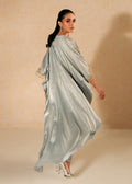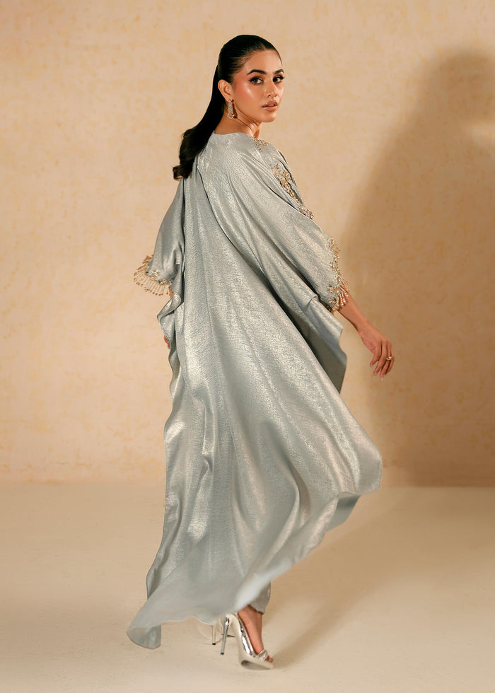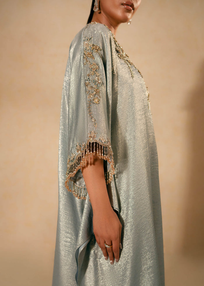 Introducing our elegant Aqua Cloud ensemble featuring a shimmer silk floor-length asymmetrical shirt. Adorned with intricate resham, crystal and pearl work embellishments and complemented by a cowled hemline; the Aqua Cloud ensemble is paired with straight pants for a perfect blend of sophistication and charm.