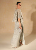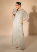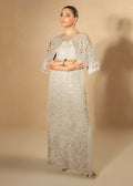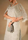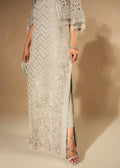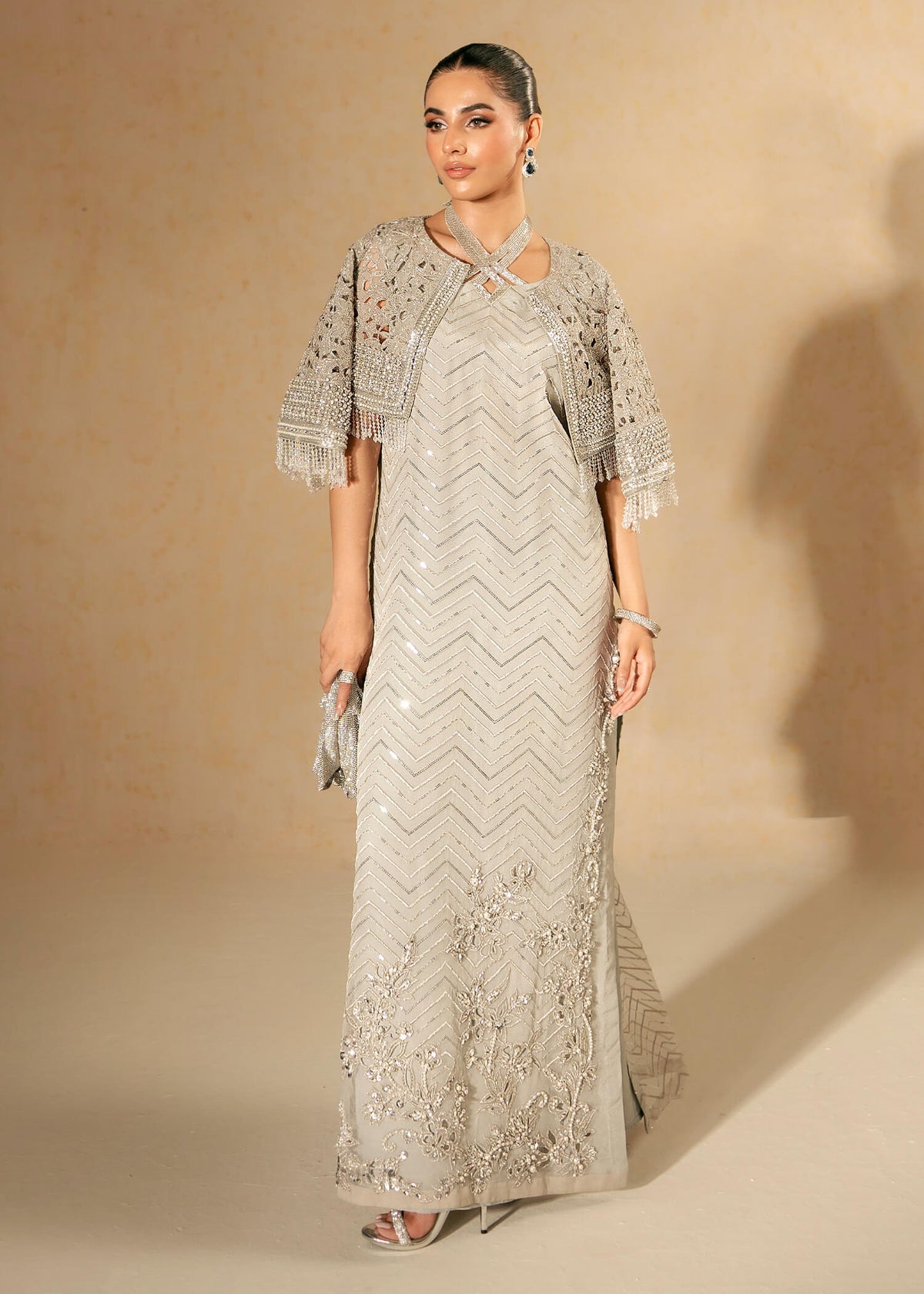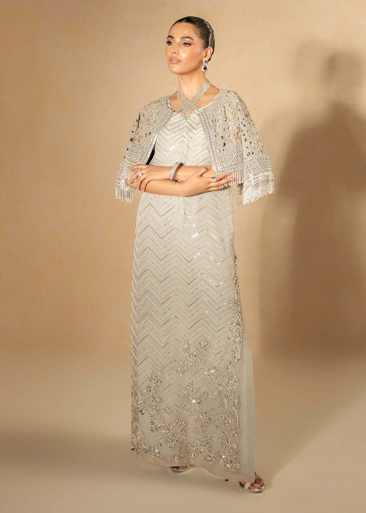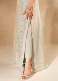 Glitz Grey, a 3-piece set features a straight silk shirt with a strappy neckline, ornamented jacket, and matching straight trousers. The shirt’s monotone embellishments enhance the geometric and floral design, showcasing intricate crystal, pearl and bead work. Paired with a cut work jacket with tassel and embellished details, this ensemble is perfect for any formal occasion.