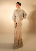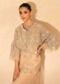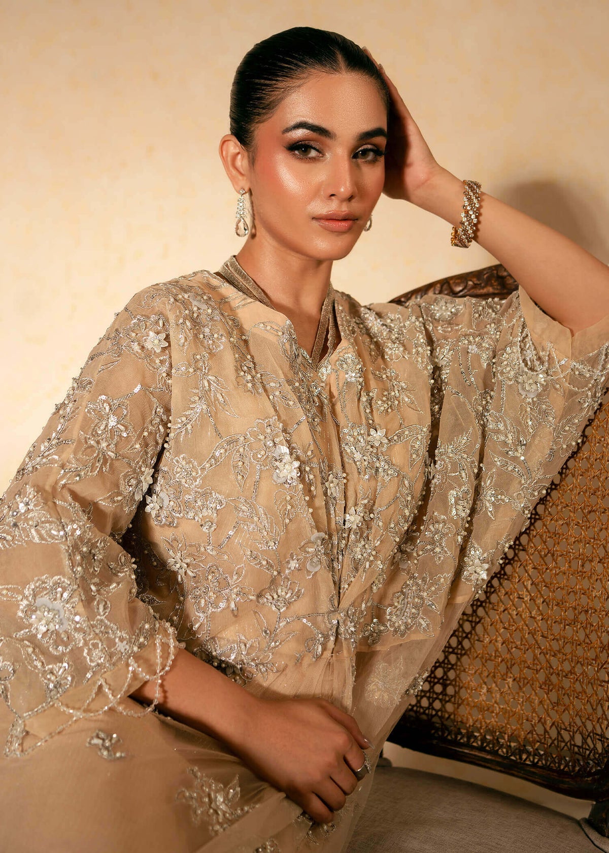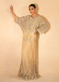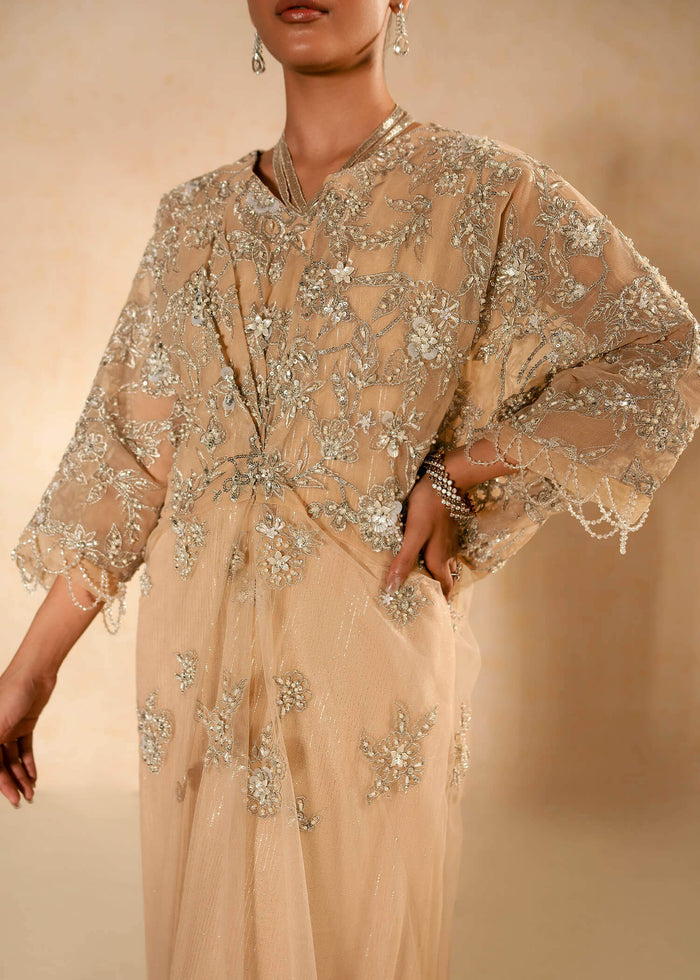 Step into elegance with our Ria Beige ensemble.The tulle net kaftan is designed with a V neckline and crafted with pearl, cut dana, crystal and swarovski work. Ria Beige features floral embellishments throughout the silhouette and is accompanied by straight pants for a sophisticated look.