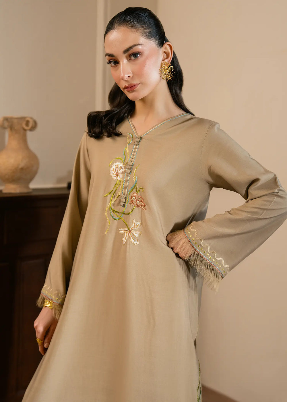 This beige straight long shirt in Cotton is adorned with delicate resham embroidery and handmade button detailing. Featuring a V neckline with embroidered, fringed sleeves and scalloped hem accents. Paired with straight pants for a clean, elegant finish