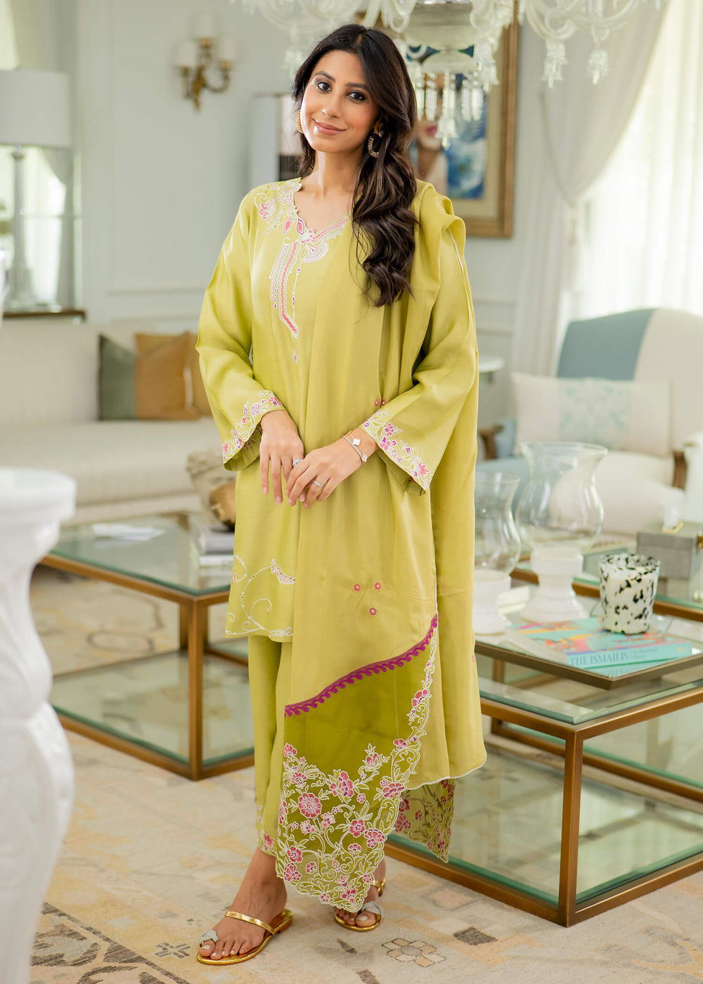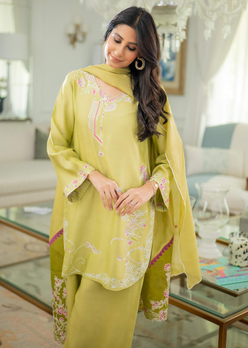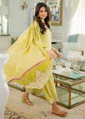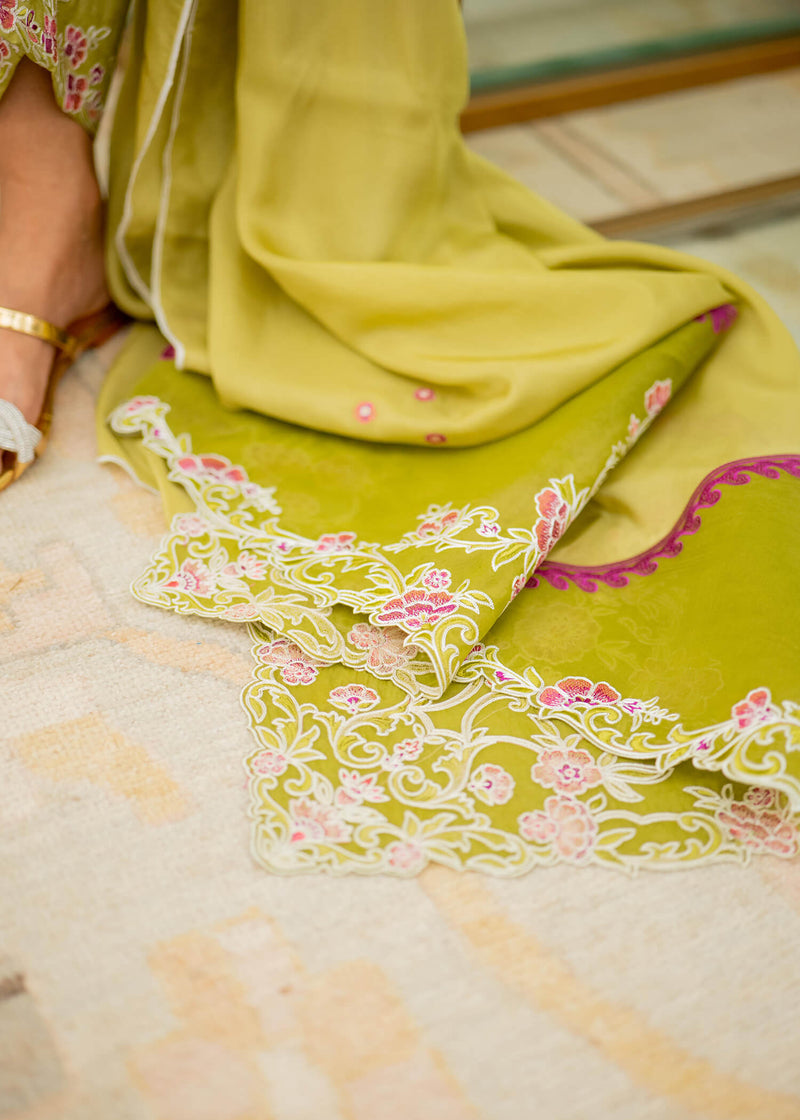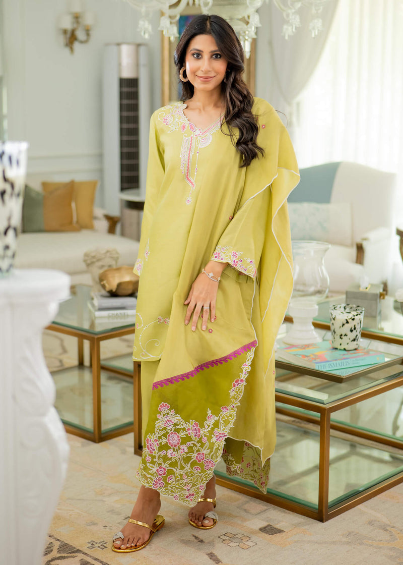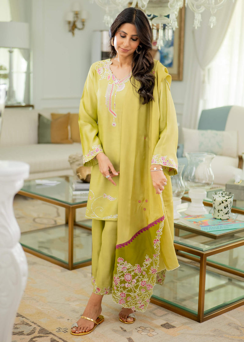 'Kiwi is a three piece ensemble featuring a short cotton silk shirt adorned with intricate embroidery. Scalloped edges on the neckline and sleeves add an elegant touch. The matching cotton silk culottes complement the ensemble with coordinating scallops and embroidery. The silk dupatta is beautifully embellished with organza patchwork and embroidery details that enhance its delicate charm.