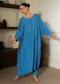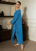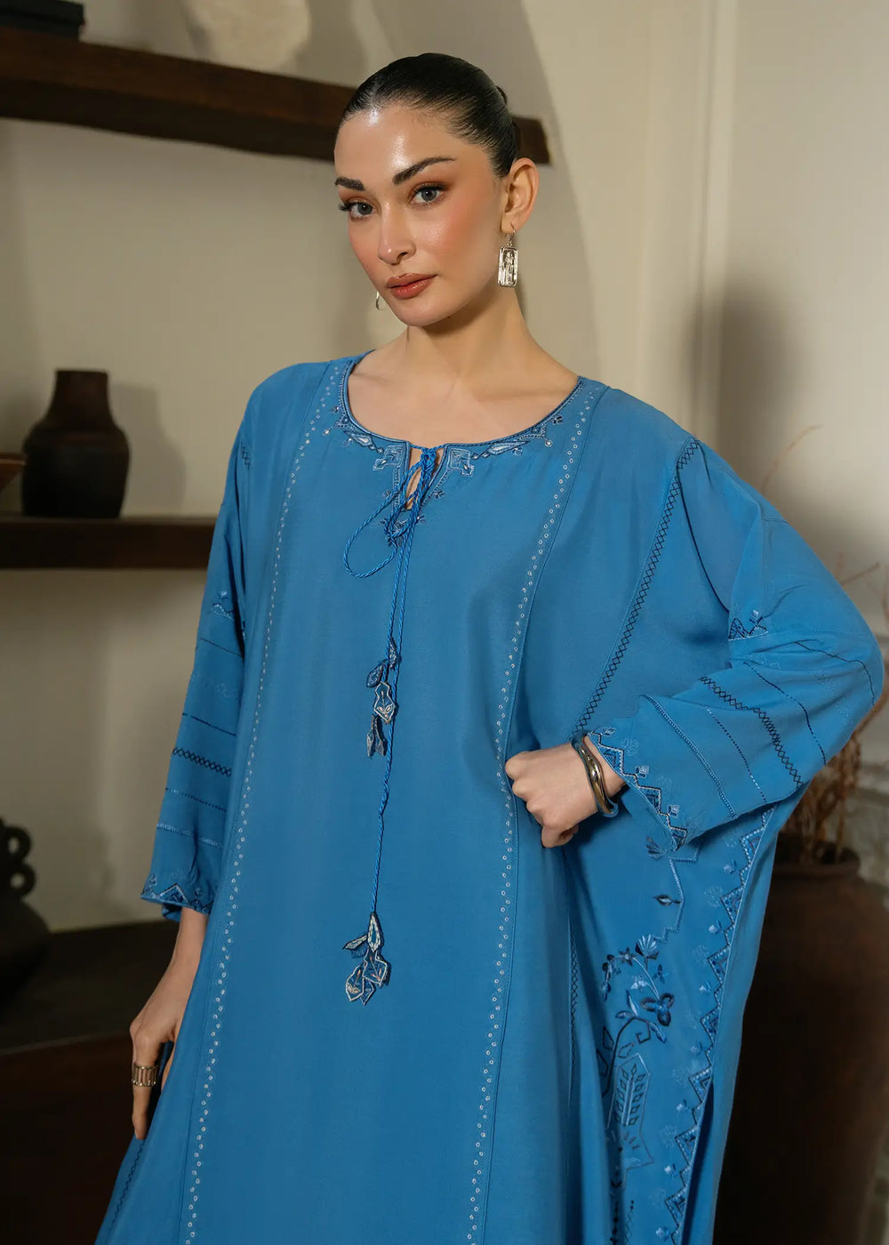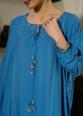 A beautiful blue kaftan in cotton is adorned with delicate resham embroidery on the front panel, side panels, and cuffs. Designed with a graceful boat neckline with a slit and finished with tassel detailing. Paired with viscose straight pants for an effortlessly elegant look.