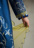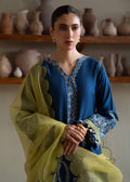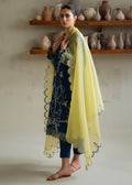 Anza Blue is a three piece ensemble. The cotton silk blue set is paired with a contrasting apple green organza dupatta with scallops. Anza Blue features artisanal embroidery in blue, white and green hues inspired by geometric motifs.