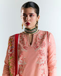 Description: This ensemble is a soft yet striking celebration of floral beauty and timeless craftsmanship. The light pink shirt is delicately adorned with pastel floral embroidery in shades of blush, ivory, and crimson, intricately arranged across the front and neckline. Its sleek silhouette is both feminine and refined, offering a flattering drape. Paired with a matching shalwar featuring monochrome embroidery and a digital floral print, the lower piece adds a gentle texture and charm to the look. The entire outfit is elevated by a digitally printed silk dupatta — a statement piece in itself — bursting with botanical motifs in vibrant hues like scarlet, sunshine yellow, and lush green, all framed in a bold red scalloped border. This look captures the softness of spring and the strength of heritage, perfect for occasions where grace meets expression.