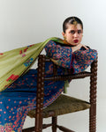 Description: This beautifully curated ensemble brings together refined craftsmanship and rich color play. The deep blue shirt serves as the focal point, adorned with intricate multicolor floral embroidery in a mix of fine threadwork and traditional motifs. The embroidery is concentrated along the neckline, sleeves, and hem, creating a balanced composition that’s both ornate and elegant. Complementing the shirt are ivory culottes featuring delicate monochrome embroidery. The fine detailing is subtle but precise, with scalloped hems and geometric patterns that are clean and structured.Draped over the shoulders is a digitally printed silk dupatta, its sage green base blooming with colorful florals, botanical elements, and bold borders. The silk adds movement and a soft sheen, making the look feel light and luxurious.