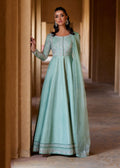 Mint Pishwash is a timeless traditional ensemble featuring a long, straight silhouette that exudes elegance and poise. Its bodice is meticulously adorned with intricate embroidery and delicate ada work, while the hemline is beautifully finished with a harmonious blend of inserted lace and complementary embroidery. Paired with classic straight trousers and a medium organza dupatta showcasing heavily concentrated embroidery and ada work on the pallo, this ensemble seamlessly combines artisanal craftsmanship with refined sophistication, making it perfect for formal occasions and celebrations of elegance.
