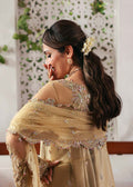Effortlessly refined, this graceful champagne beige ensemble captures understated sophistication with a timeless allure. The design features hand-embellished net panels and refined borders, paired with intricately worked sleeves that add depth and detail. A cutwork neckline enhances the elegance, while the embroidered net dupatta with pallu detailing drapes with fluid grace. Completed with a matching trouser and a tissue inner for a delicate layered effect, the look is further elevated by colli sequin spray and artisanal adda work, creating a perfect harmony of subtle shimmer and fine craftsmanship.