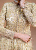 Showcase timeless beauty in this elegant pearl white ensemble. The organza centre-slit pishwas-style shirt is adorned with intricate embroidery and delicate ada work, exuding a refined, regal charm. Paired with crushed jamawar-print flared pants that lend a rich traditional touch, and a matching bustier for a structured finish, this outfit seamlessly fuses classic artistry with contemporary sophistication—perfect for weddings and grand celebrations.