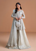 Radiate elegance in this refined moonlit silver peplum ensemble. The sleek tissue shirt features tailored sleeves and is lavishly adorned with intricate embroidery and delicate ada work, lending it a luxurious texture and subtle gleam. Paired with coordinating tissue pants enhanced by a soft gradient spray effect, the set strikes a perfect balance between modern glamour and timeless charm. A sheer, flowy organza dupatta completes the look, adding lightness and grace ideal for festive soirées and formal celebrations.
