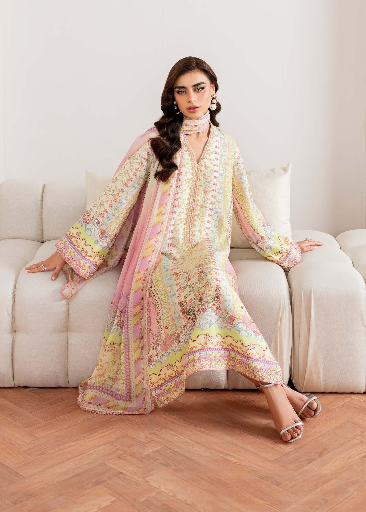 Delicate and timeless, this Two-Piece Pure Raw Silk Ensemble is a soft symphony of pastels and elegance. The design features a soothing combination of blush pink, mint green, and powder blue floral patterns, giving it a refreshing and graceful aesthetic. The shirt is adorned with intricate embroidery along the neckline, sleeves, and hem, further enhanced with shimmering diamanté embellishments that add just the right amount of sparkle. Paired with matching embroidered trousers and a coordinating dupatta, this look is perfect for day-time events and Eid festivities..