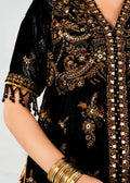 A luxurious, open-front shirt crafted from black shimmer velvet and intricately embellished with crystal-cut beads and Swarovski crystals. The design showcases a pattern-aligned dabka edging, with layers of meticulously placed baitki in a crane motif. The gown is adorned with short sleeves, each accented by long, black tassels for a touch of drama. Paired with it are three-panel jamawar azaar pants, featuring a black shimmer velvet base with delicate embroidery. The ensemble is completed by an embroidered organza dupatta, framed by a four-sided velvet border.