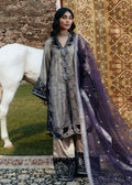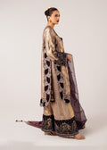 A sophisticated long shirt crafted in grey shimmer shamose, elegantly detailed with purple handworked velvet on the neckline, side borders, sleeves, and hemline. The shirt is adorned with handmade floral buttons, adding a delicate charm. Paired with straight azaar pants in grey-gold Shimmer shamose, featuring purple velvet borders embellished with sequins and embroidered motifs. Completing the ensemble is a purple organza dupatta with a velvet pallu, sequined embroidered lining, and tassels on each corner.