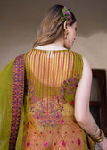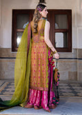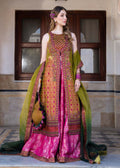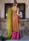 Fiora exudes charm with its front-open shirt in green organza, adorned with delicate tassel details and intricate sequence work. Paired seamlessly with pink jamawar sharara pants and a organza dupatta featuring rich heavy borders, this ensemble epitomizes elegance and allure