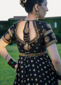 A captivating black ensemble that exudes timeless grandeur. This pishwas is adorned with intricate golden Mukesh handwork along the borders, with sequins and antique motifs flowing into a voluminous flare scattered with gold accents. A keyhole back with beaded tassels adds a modern, regal touch. The short embroidered sleeves and the hemline with metallic fringes enhance its drama, while the sheer dupatta, finished with bold handwork motifs and a detailed border, completes the look.