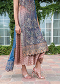 An ethereal lilac-grey ensemble with hints of copper, crafted for understated luxury. This kameez features a sheer neckline and front slit, adorned with silver and blue threadwork, sequins, and crystal embellishments that shimmer like moonlight, while scalloped floral motifs add sophistication. Paired with metallic sequence trousers and a contrasting slate-blue dupatta detailed with embroidery and tassels, this look captures the quiet glamour of a starlit night