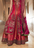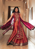 A regal ruby-red ensemble that radiates opulence and timeless charm. This deep V-neck kameez features intricate golden Zari and Resham hand embroidery, sequins, and cascading floral motifs, opening into a flowing silhouette with a subtle front slit. It is paired with wide-legged trousers detailed with ornate embroidered panels and a contrasting geometric border. A sheer dupatta with sequined accents and a heavily embroidered frame completes this majestic look.