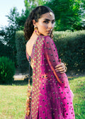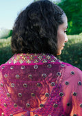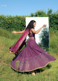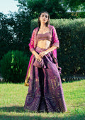 An enchanting magenta and plum lehenga set that embodies artistry and opulence. The hand-embroidered choli with a sweetheart neckline and tie-up back shimmers with sequins and mirror-like embellishments. Paired with a flared lehenga featuring golden architectural motifs and ornate patterns, and a sheer dupatta with gilded edges and sequined accents, this ensemble blends traditional craftsmanship with contemporary allure