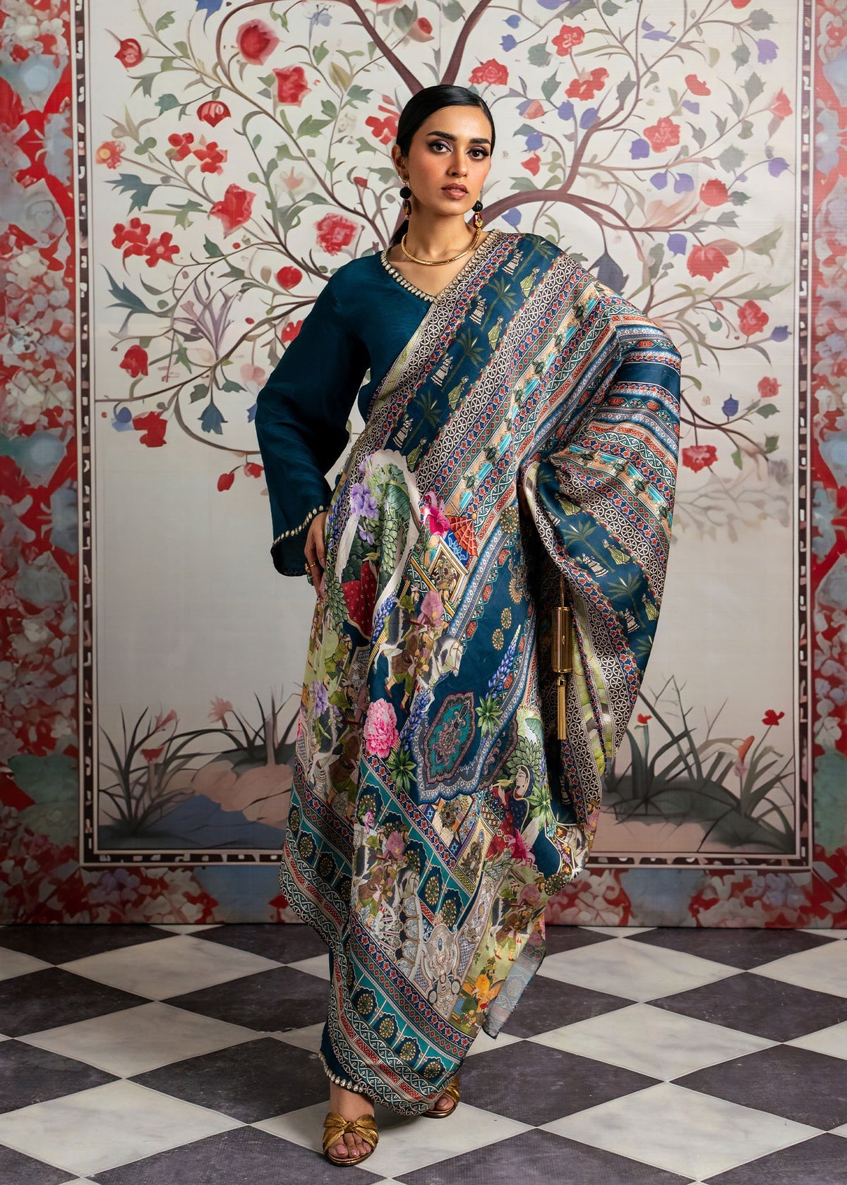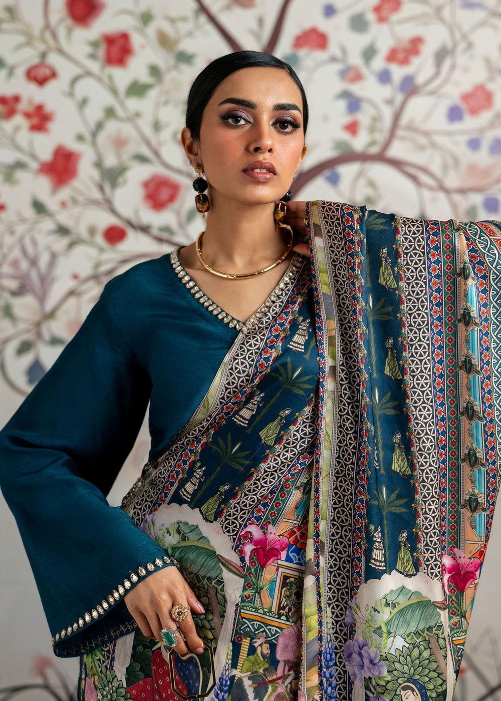 Minah from Echoes of Elara is a bold yet graceful statement in deep blue hues. Crafted from luxurious Korean raw silk, the long shirt and trousers exude refined elegance, while the fluid grip silk cape adds a touch of modern sophistication.