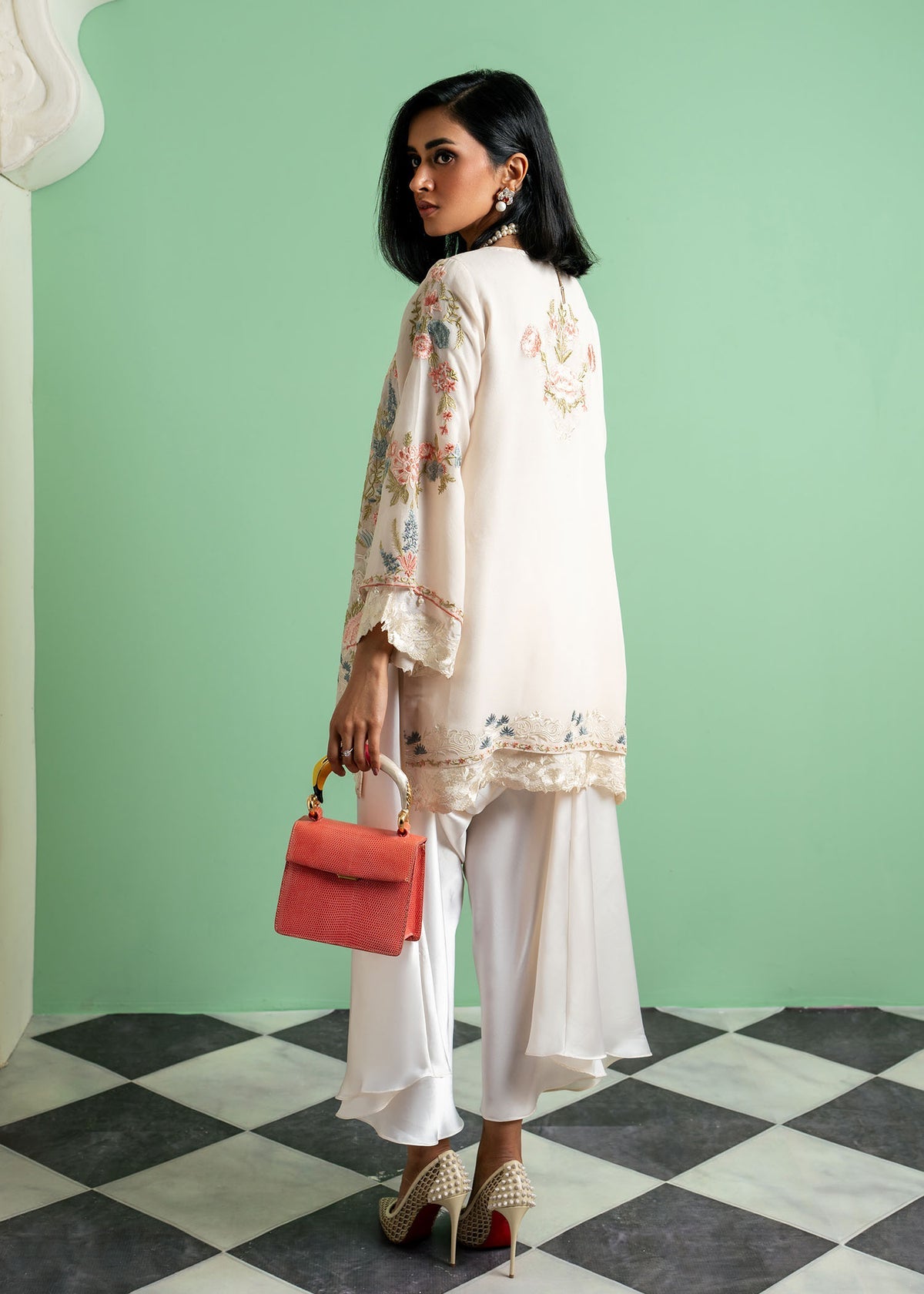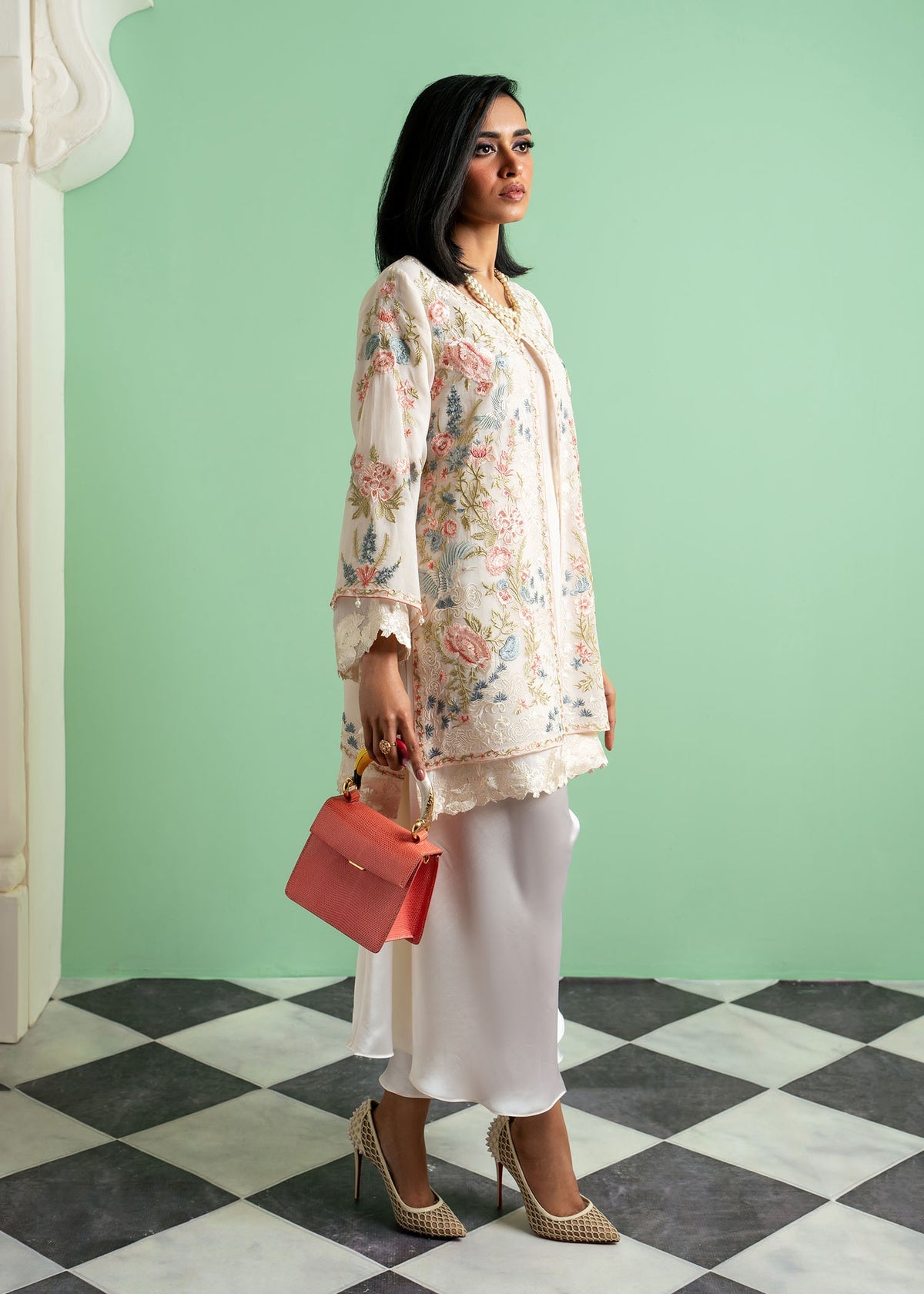 Soft Dust from Echoes of Elara embodies ethereal elegance in a dreamy ivory hue. Crafted from delicate chiffon, the long shirt flows effortlessly, exuding grace and sophistication. Paired with lustrous satin trousers, this ensemble offers a perfect blend of softness and structure.