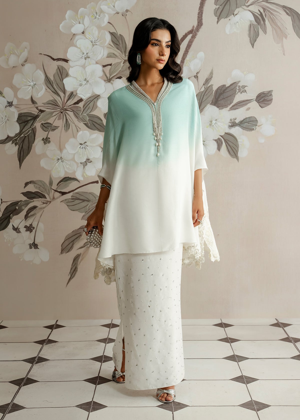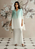 An aqua-hued masterpiece tailored in luxurious Korean raw silk. The kurti’s fluid silhouette and refined detailing exude effortless grace, making it a perfect pick for daytime festivities or serene evening gatherings. A look that breathes calm sophistication in every fold.