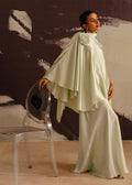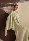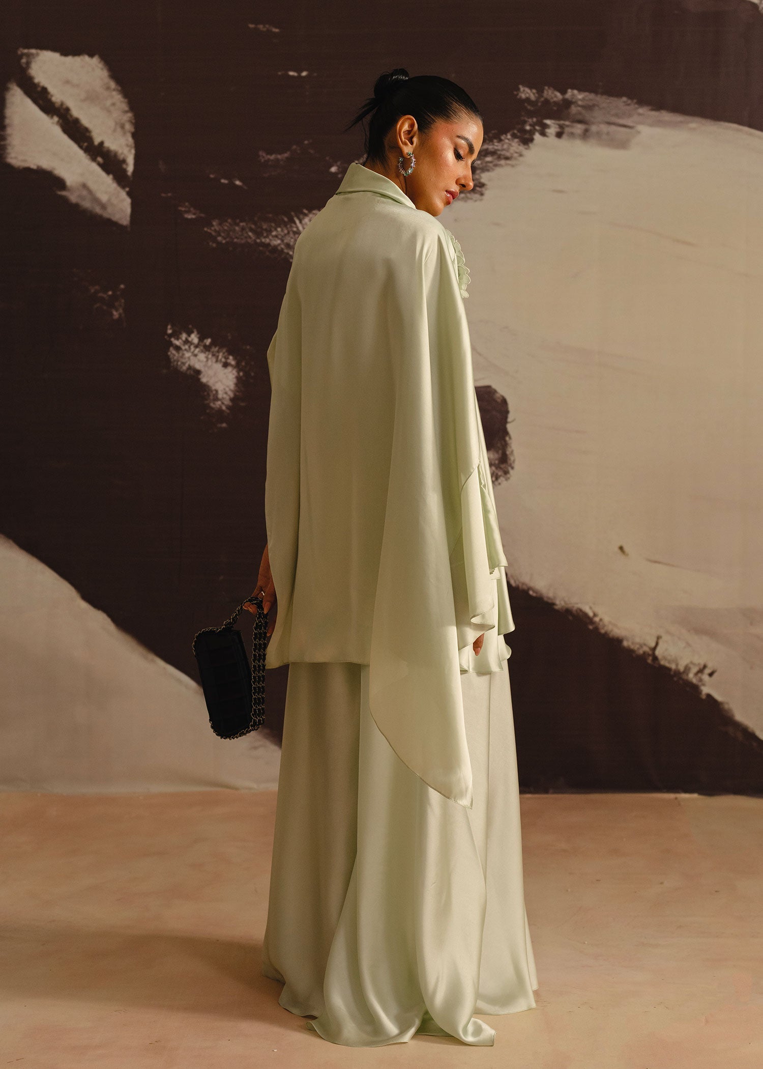 Embrace the charm of Essence, a sage green kurti designed in luxurious satin. The smooth, lustrous shirt pairs elegantly with matching satin sharara trousers, creating a graceful, flowing silhouette. Ideal for both formal and festive occasions, this ensemble exudes effortless sophistication