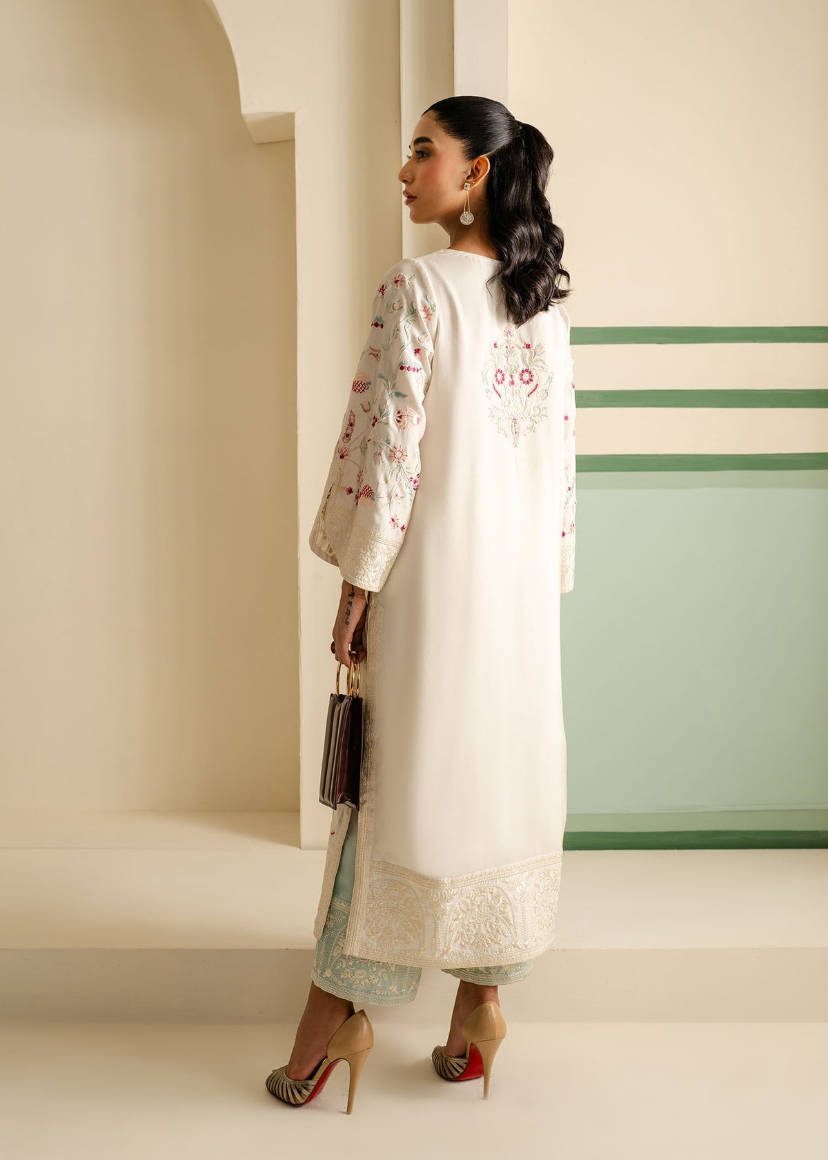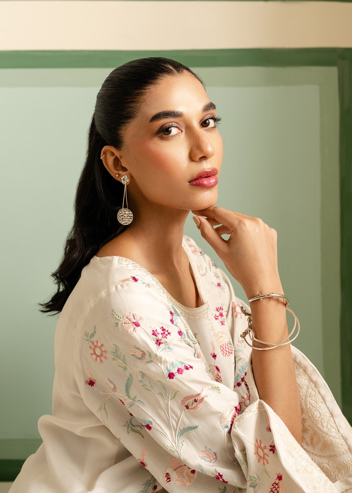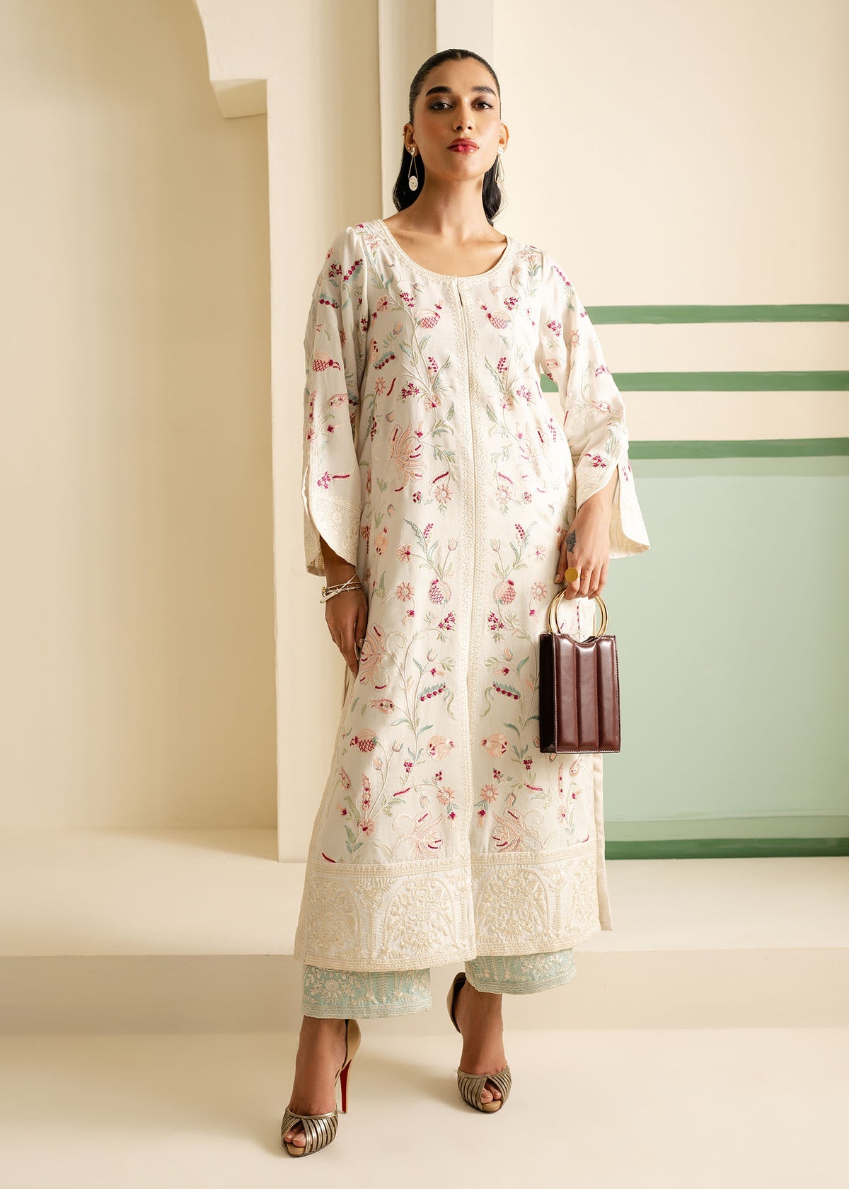 Garden Song from Nooreh — a serenade to elegance in timeless ivory. The Korean raw silk long shirt drapes beautifully over matching raw silk trousers, creating a harmonious silhouette. A sophisticated ensemble that echoes the gentle rhythm of nature, effortlessly blending grace with modern luxury.