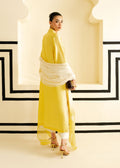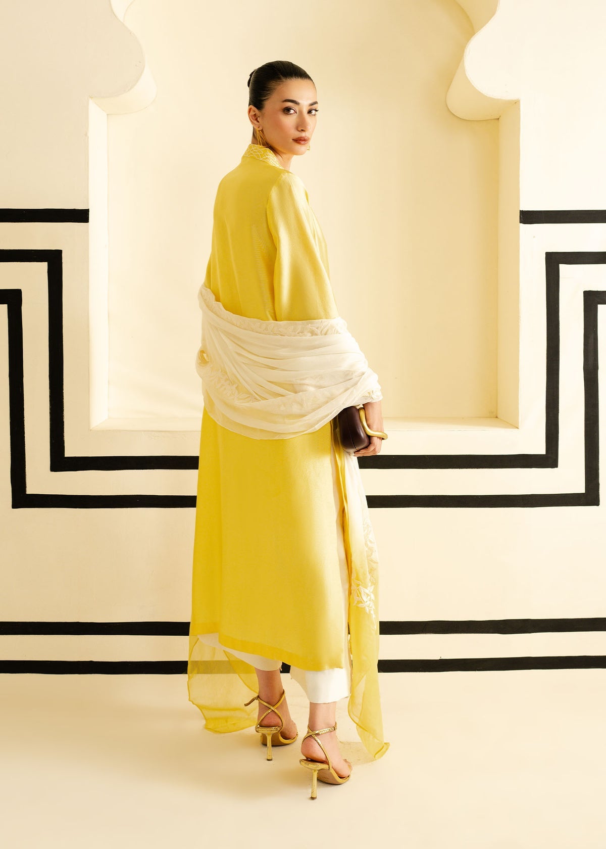 Sunlit Veil from Nooreh — a radiant ode to golden mornings. This long shirt in luminous yellow, crafted from tassle silk and paired with raw silk trousers, glows with effortless grace. Light, uplifting, and full of warmth — it’s sunshine, stitched into elegance.